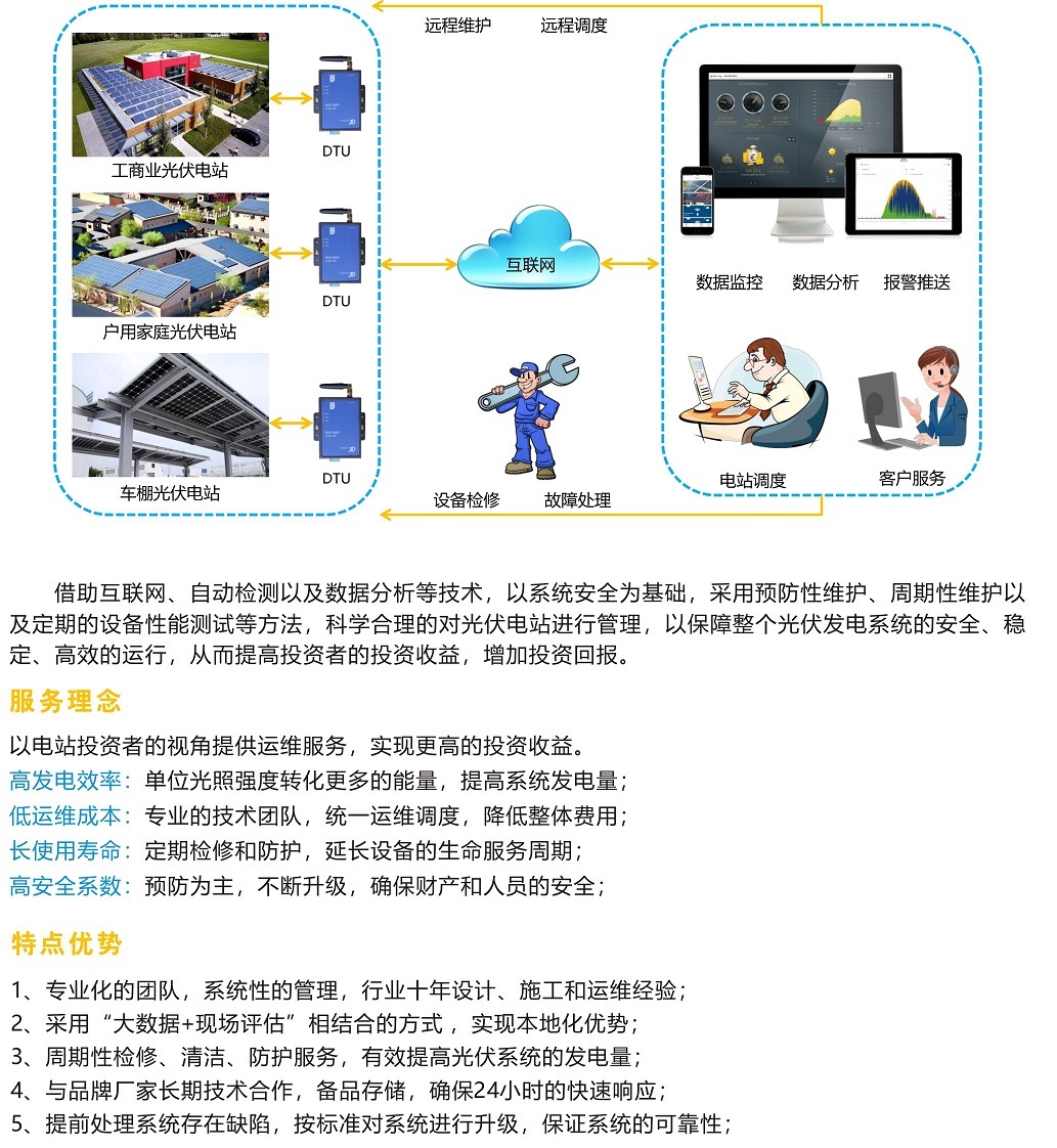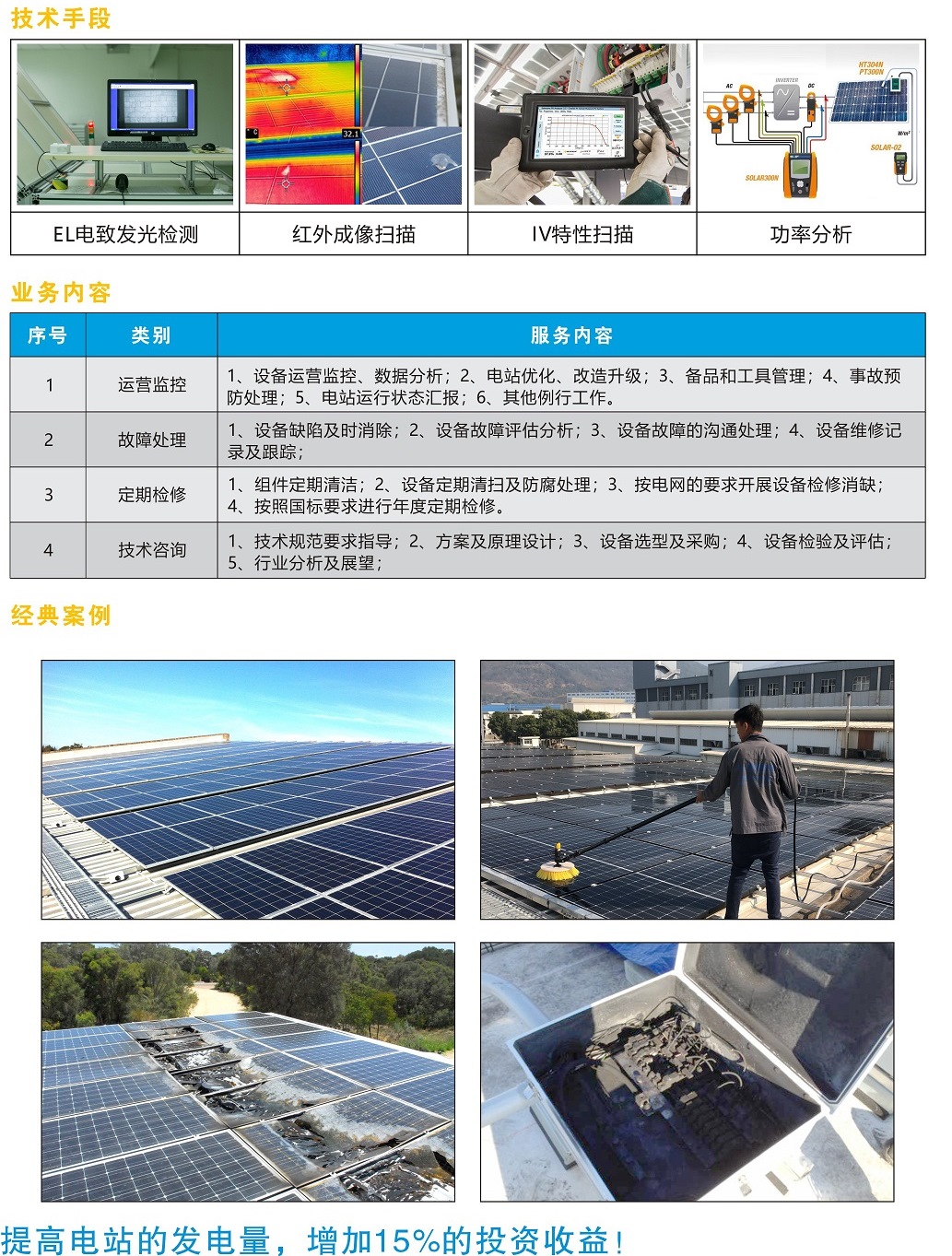 以系統(tǒng)安全為基礎(chǔ),采用預(yù)防性維護(hù)、周期性維護(hù)以及定期的設(shè)備性能測(cè)試等方法,科學(xué)合理的對(duì)光伏電站進(jìn)行維護(hù)和管理,涉及故障檢測(cè)、設(shè)備維修升級(jí)、組件清洗、除塵等業(yè)務(wù),以保障整個(gè)光伏發(fā)電系統(tǒng)的安全、穩(wěn)定、高效的運(yùn)行,從而提高投資者的投資收益率。